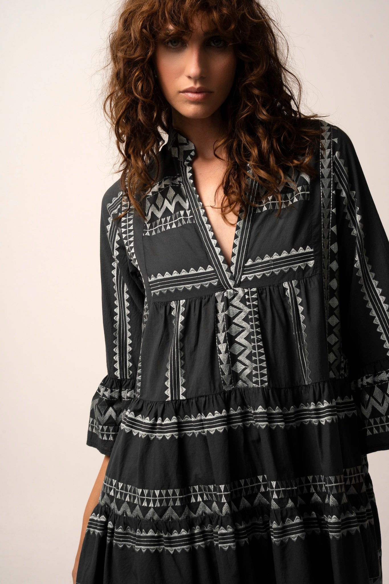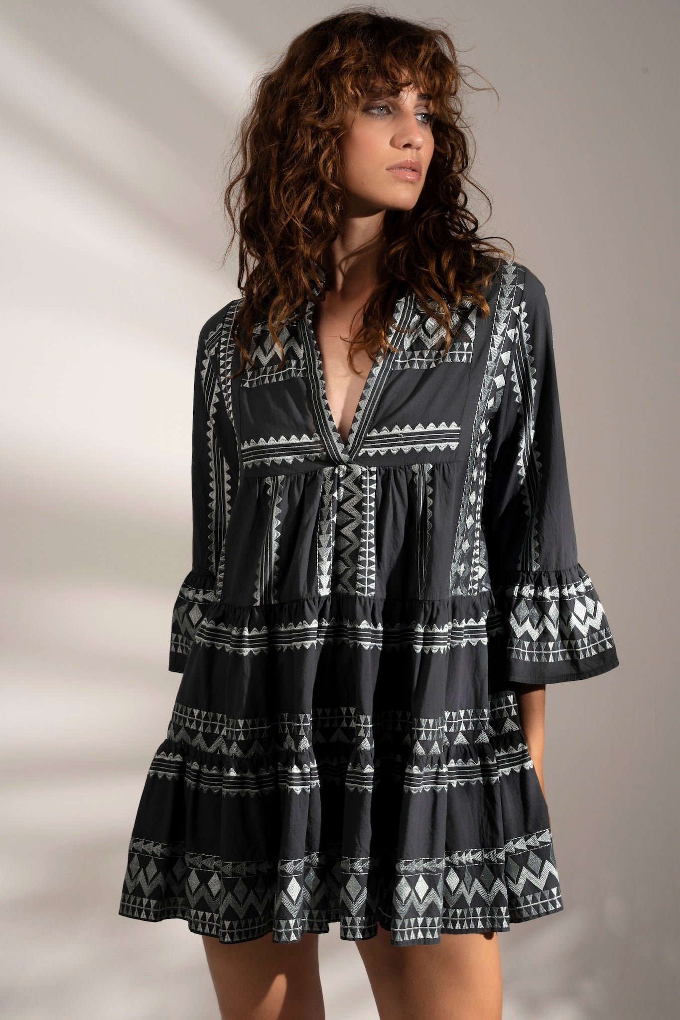 The Aether Concept Dress features a sophisticated charcoal hue accented with subtle silver detailing, creating an understated yet striking look. Its mini tiered skirt and relaxed fit provide comfortable movement, while the 3/4 sleeves and collar neckline offer a polished silhouette suitable for various occasions. This dress combines modern design with expert tailoring, making it a versatile addition to any wardrobe.