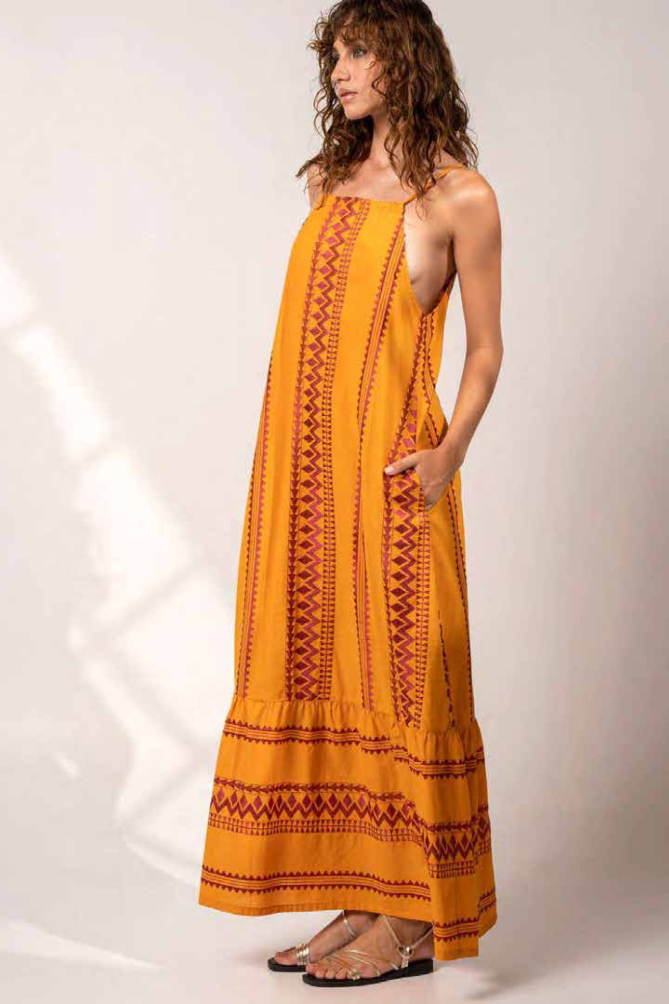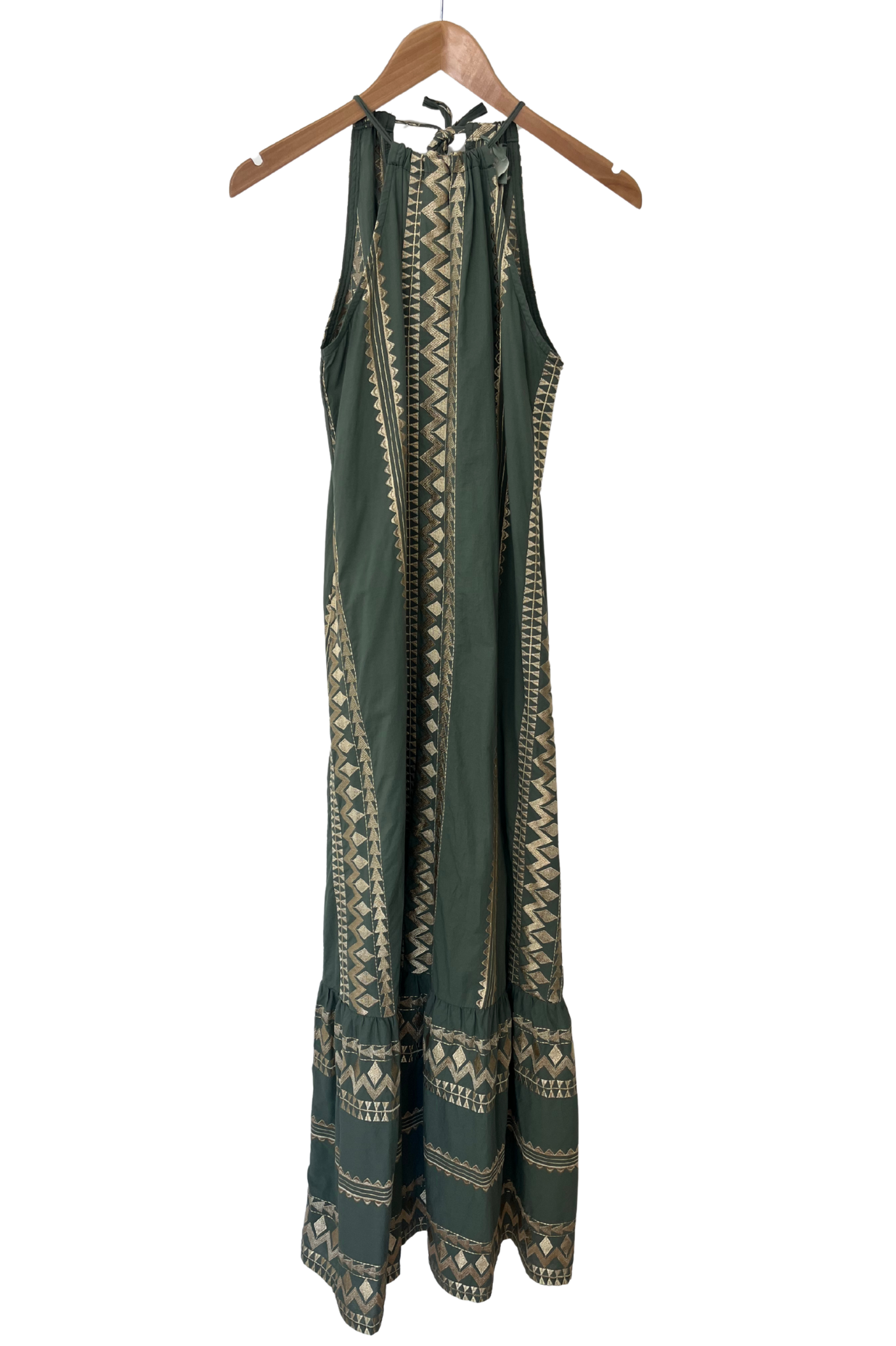 This Aether Concept Dress features a sophisticated maxi silhouette in khaki, accentuated by subtle gold detailing for a refined touch. Its sleeveless design with delicate thin straps and a squared neckline offers an elegant frame, while the tiered skirt adds movement and depth.