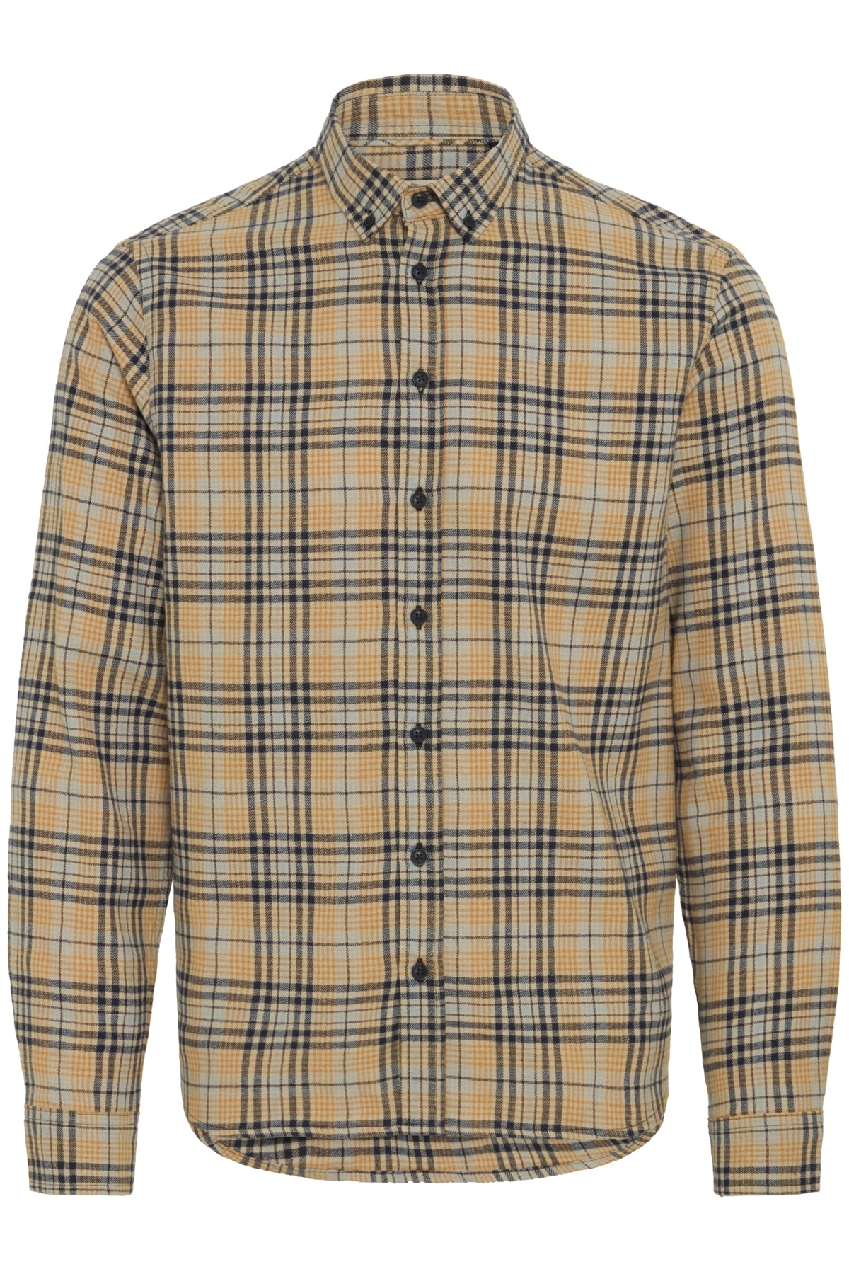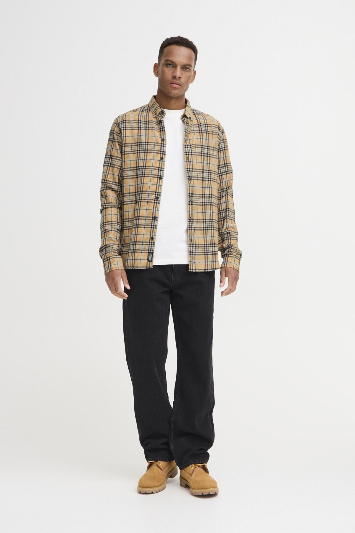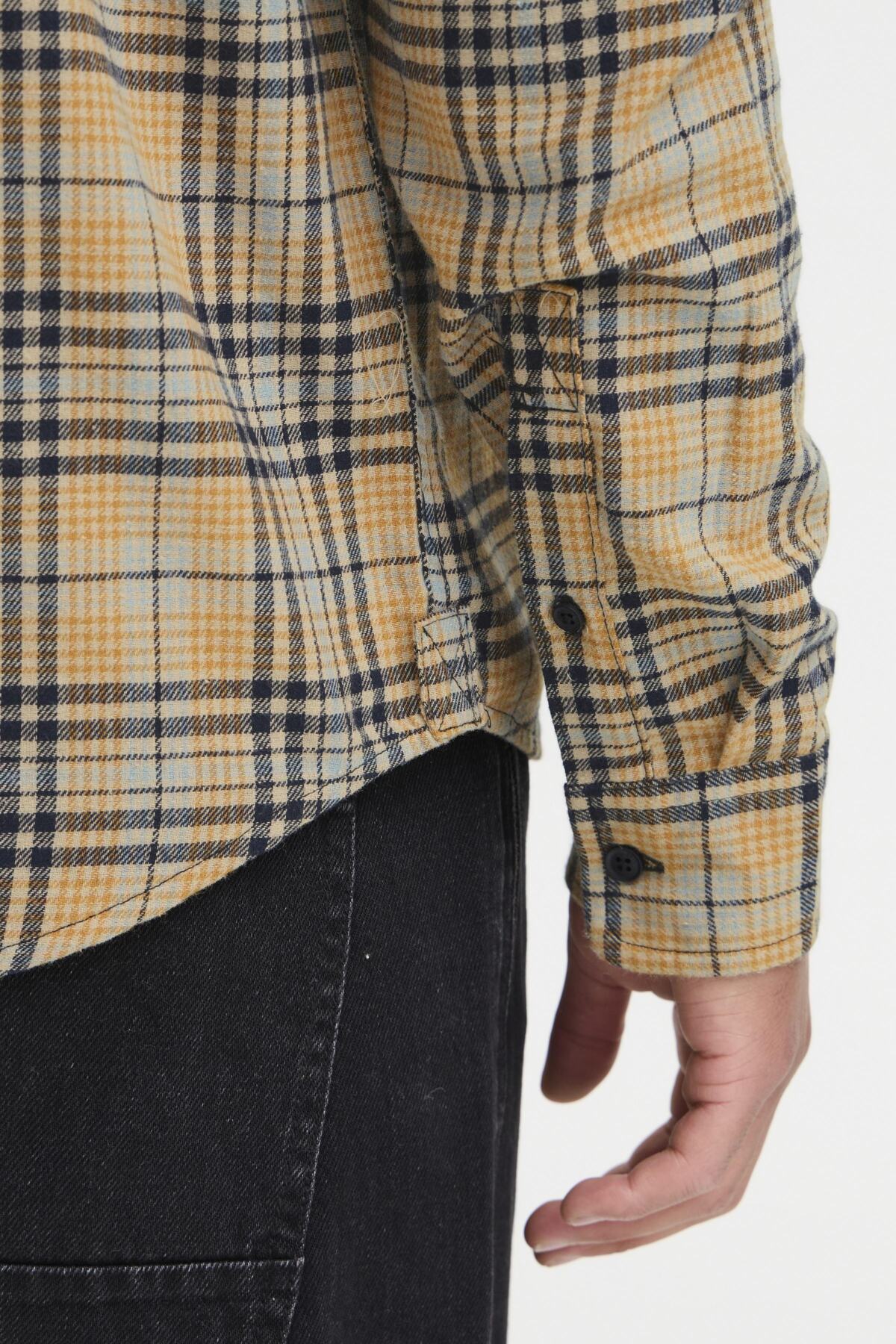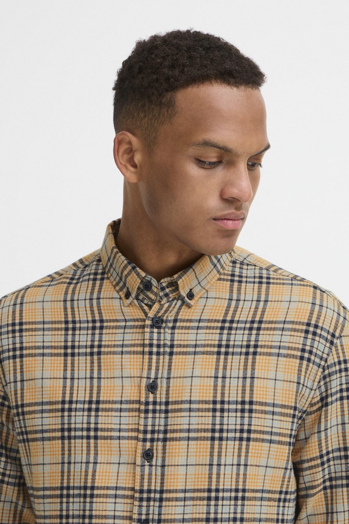 The Blend Salute Shirt features a distinctive salute check pattern. This men's shirt showcases a classic button-down collar and long cuffed sleeves. Crafted with attention to detail, this piece transitions seamlessly from office to weekend wear, making it an essential addition to any wardrobe.
