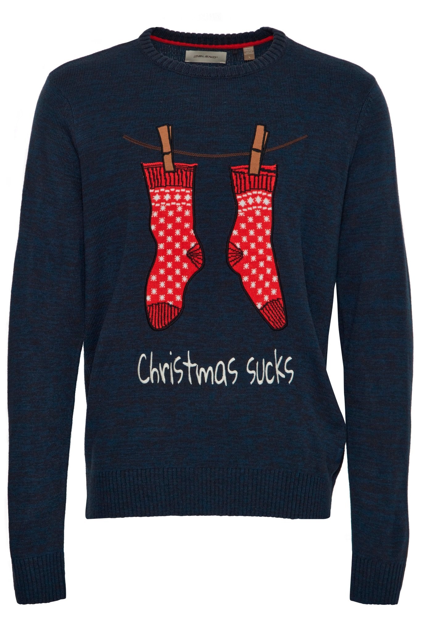 Boost your holiday spirit with our Blend Christmas Pullover. This cozy navy pullover features a playful print of red Christmas socks, perfect for the festive season. The relaxed fit, long sleeve, and round neck design provide comfort while the cuffed hem and sleeves add a touch of style.