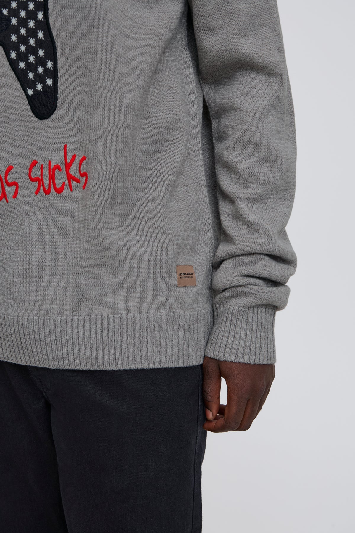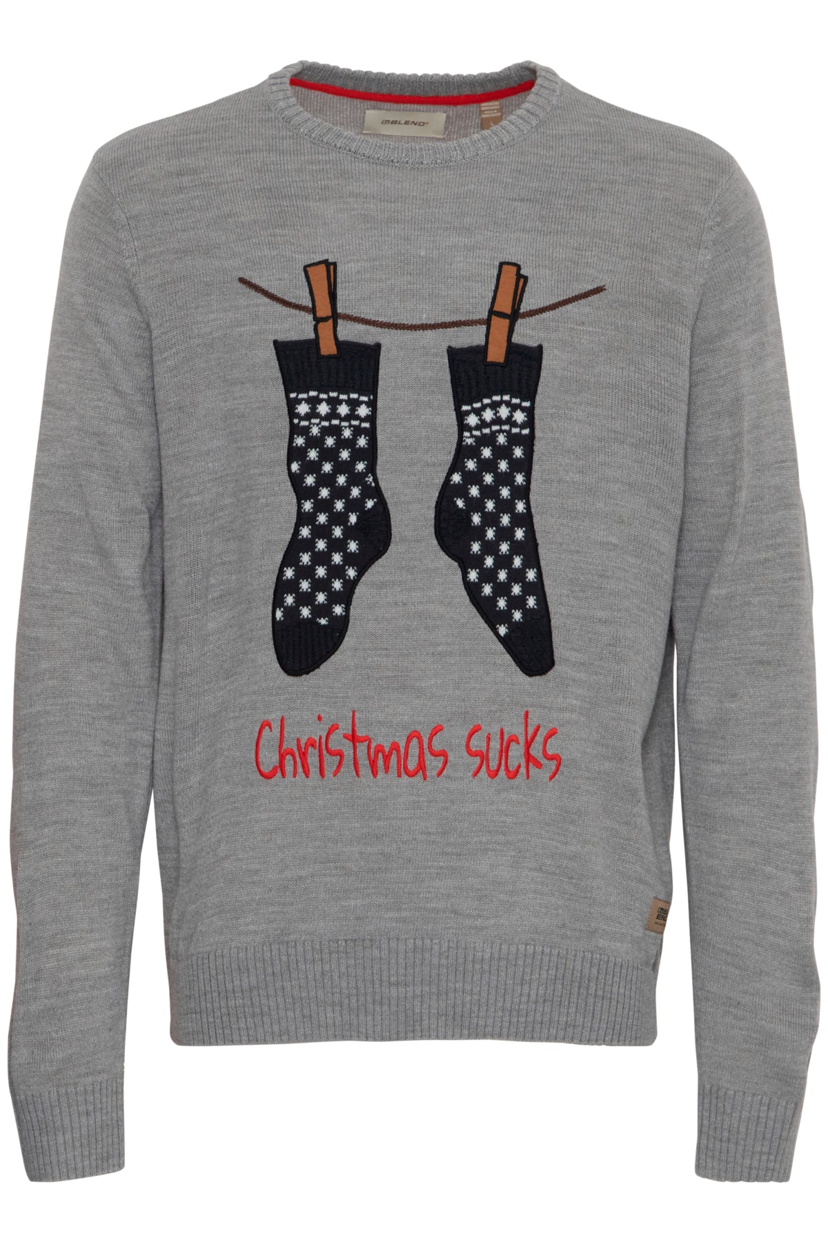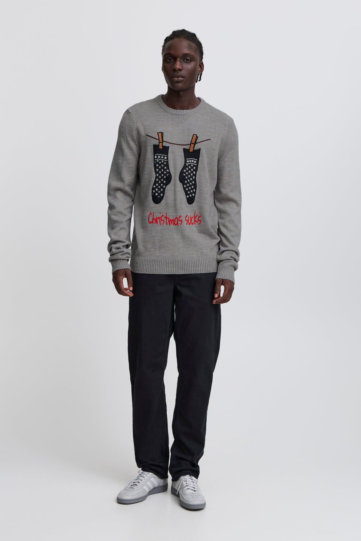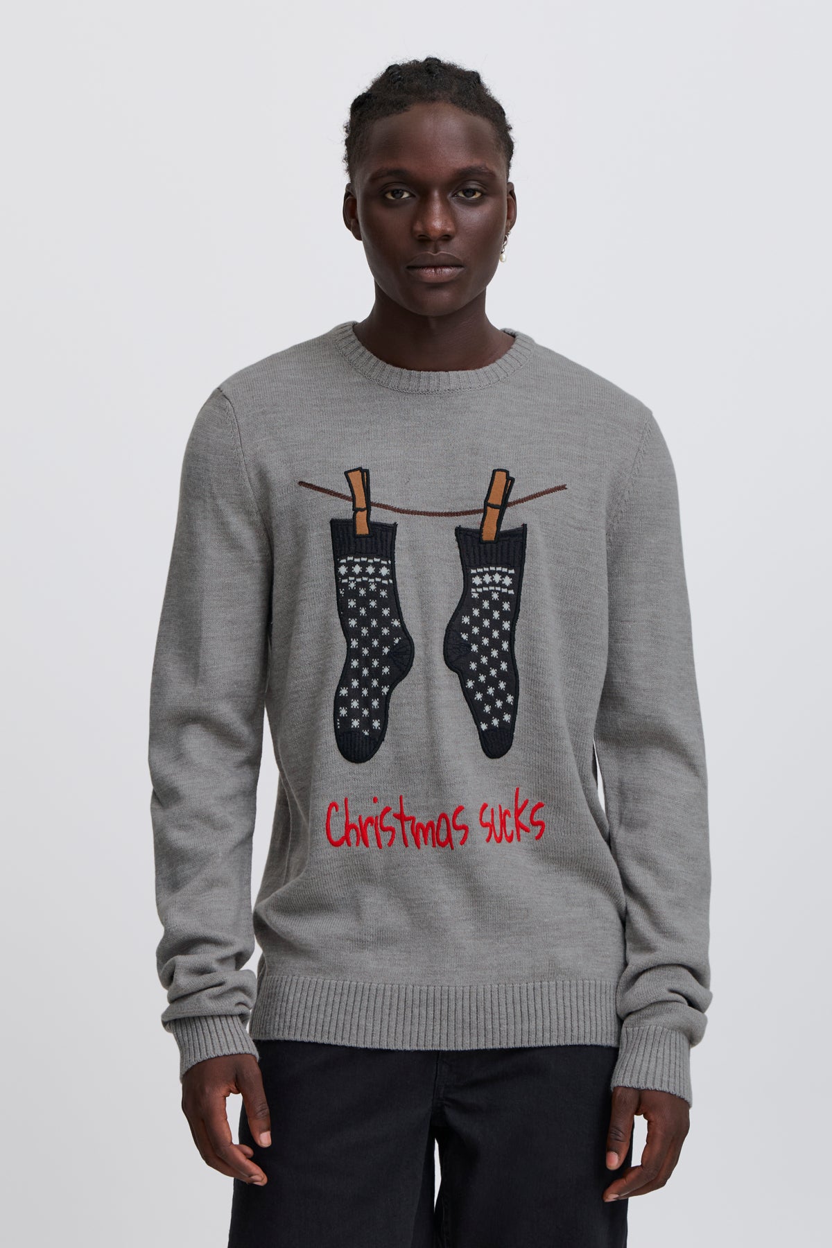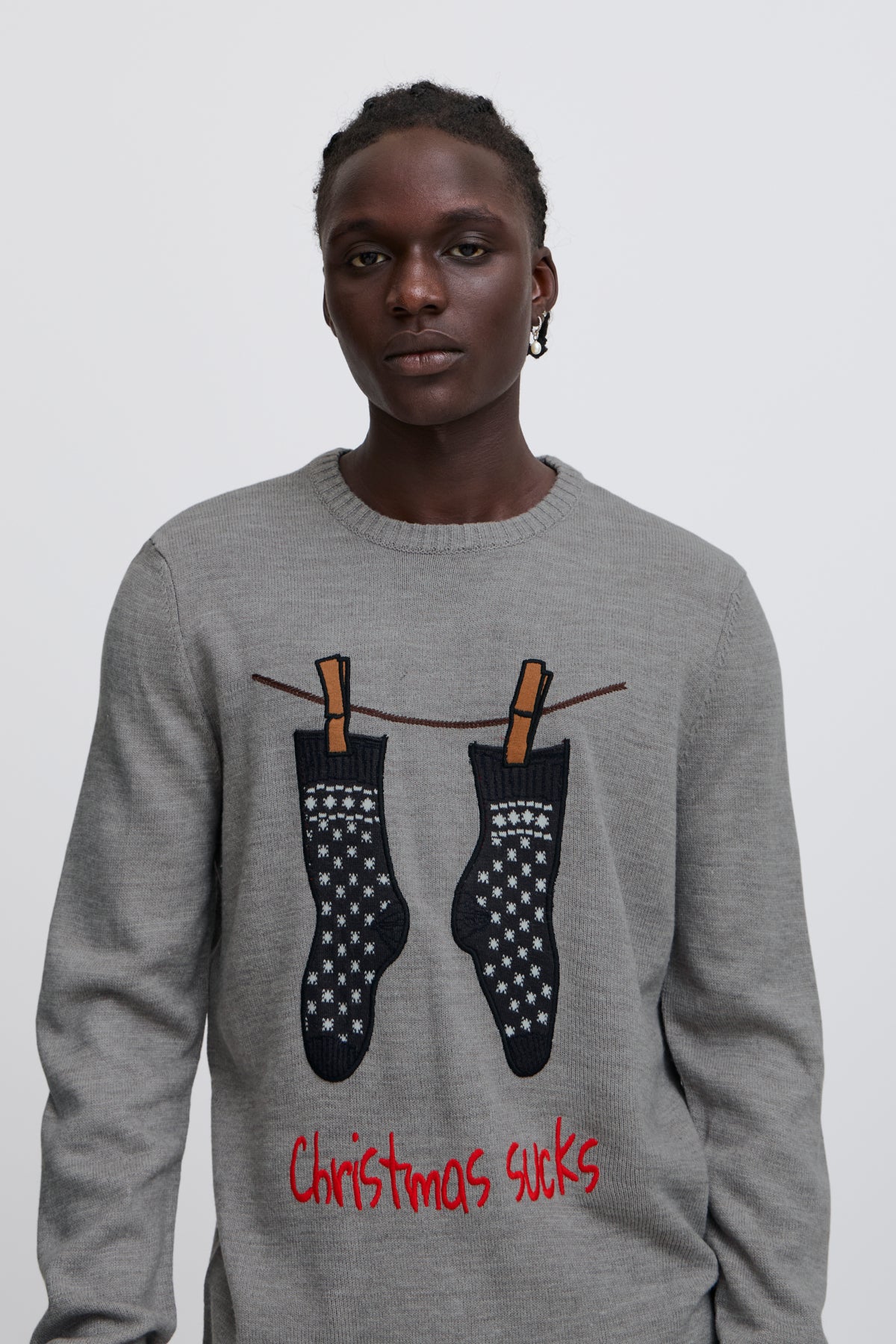 Boost your holiday spirit with our Blend Christmas Pullover. This cozy Grey pullover features a playful print of red Christmas socks, perfect for the festive season. The relaxed fit, long sleeve, and round neck design provide comfort while the cuffed hem and sleeves add a touch of style.