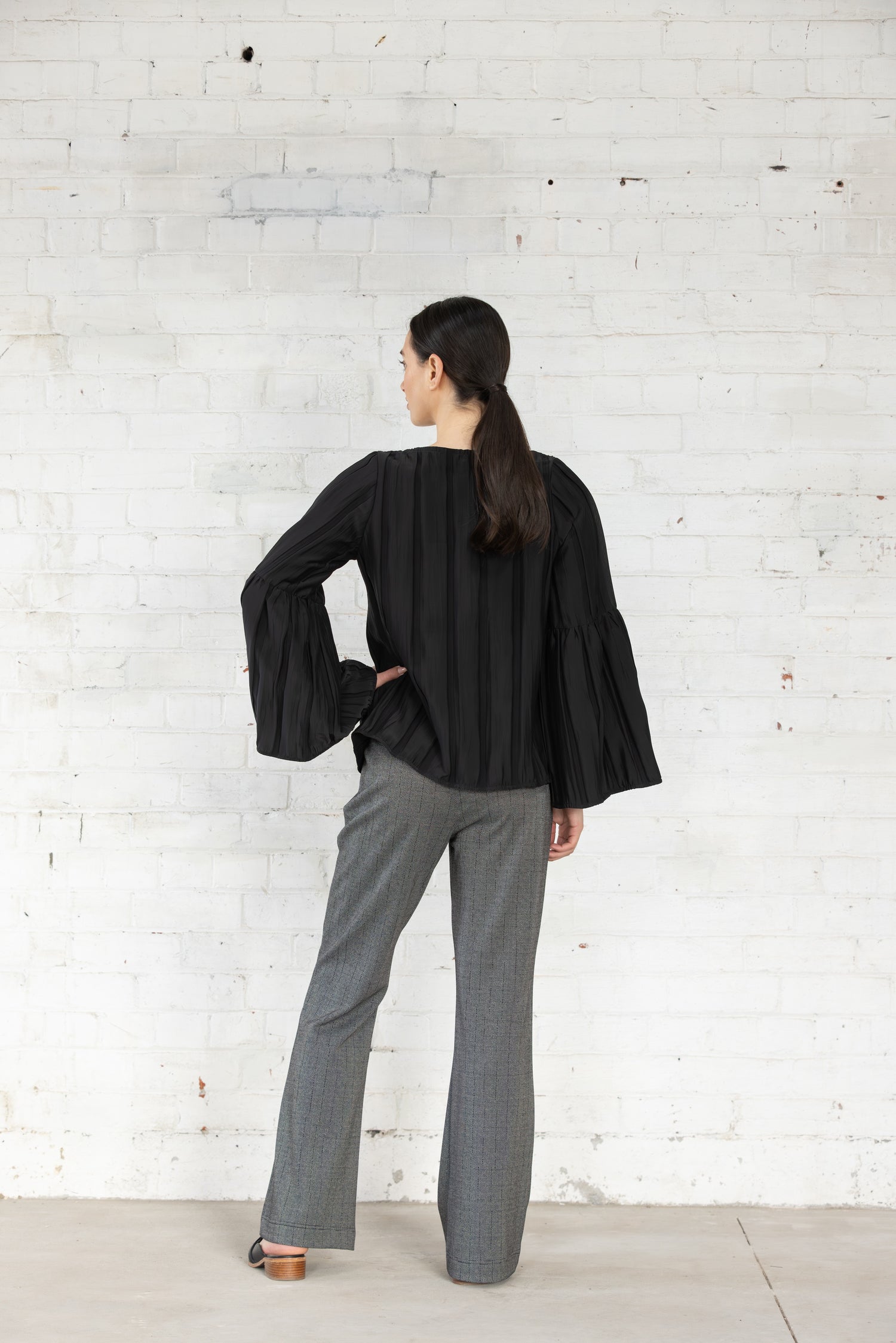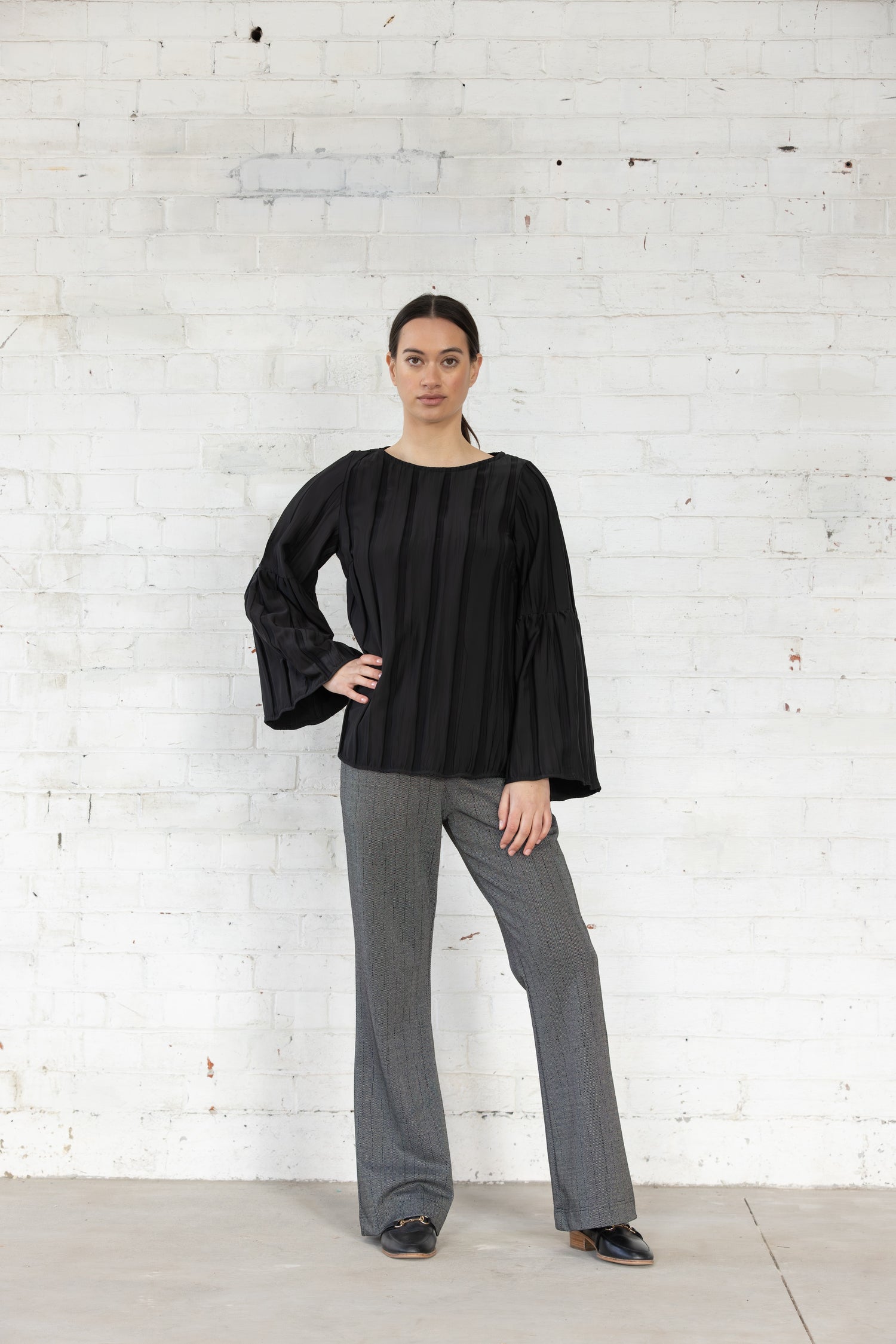 The Dressed Solace Top in black offers a relaxed fit with thoughtfully designed fluted sleeves. The textured stripe fabric adds subtle dimension while the crew neck provides a timeless finish. Designed for both comfort and style, this versatile piece transitions effortlessly from day to night.