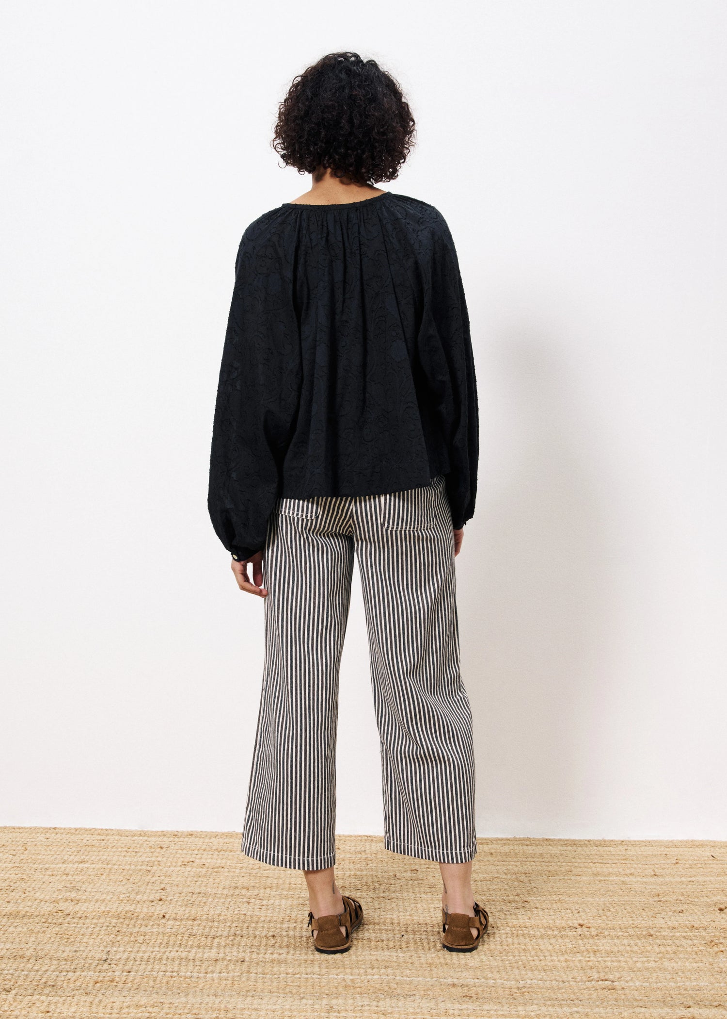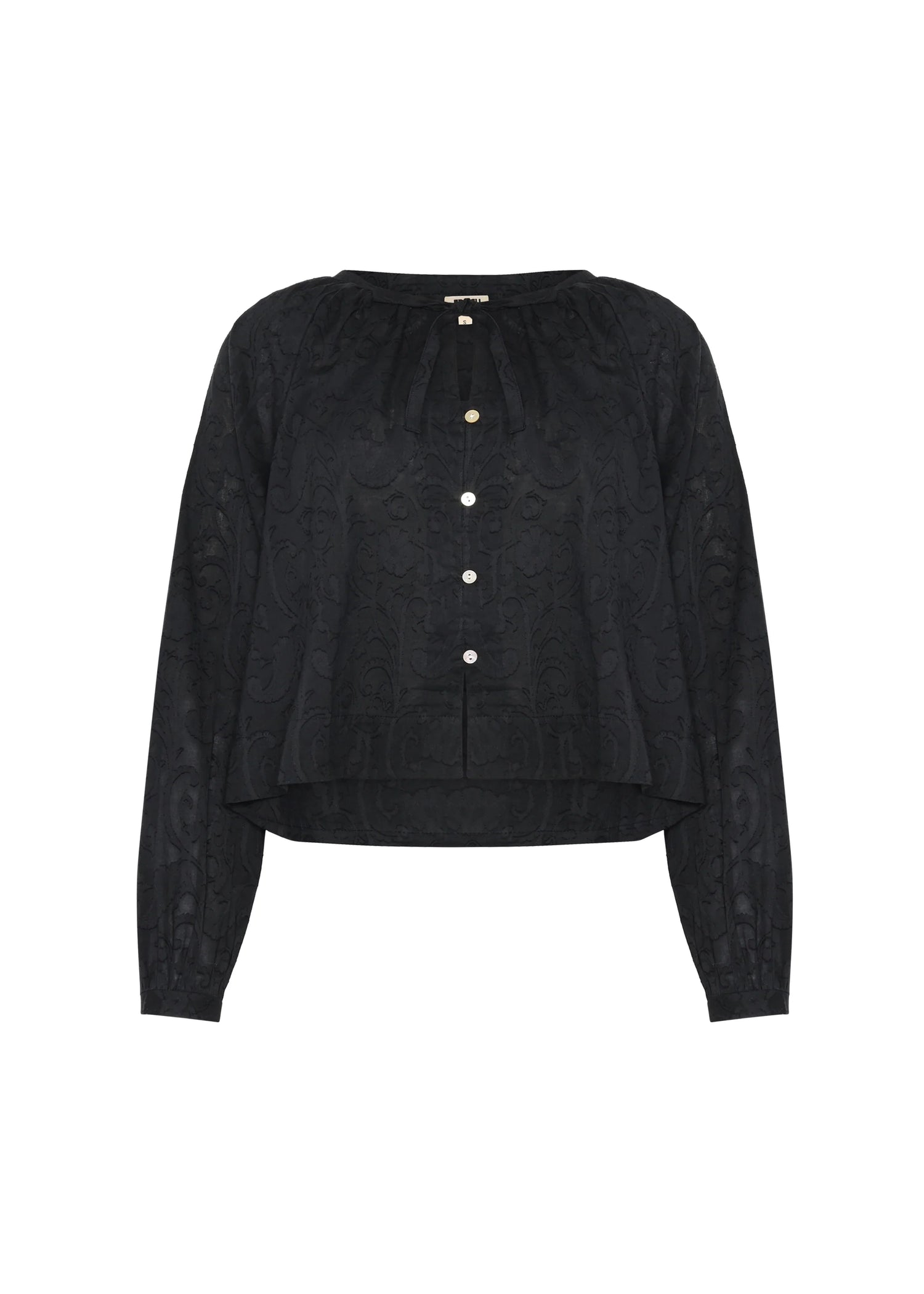 Elevate your wardrobe with the FRNCH Cedella Blouse, a refined long-sleeved black shirt featuring a distinctive Mao collar elegantly tied with a bow. Crafted from textured, flowing fabric, this blouse offers both comfort and a poised silhouette, making it ideal for professional and sophisticated settings. Its subtle details and quality material ensure lasting style and versatility.