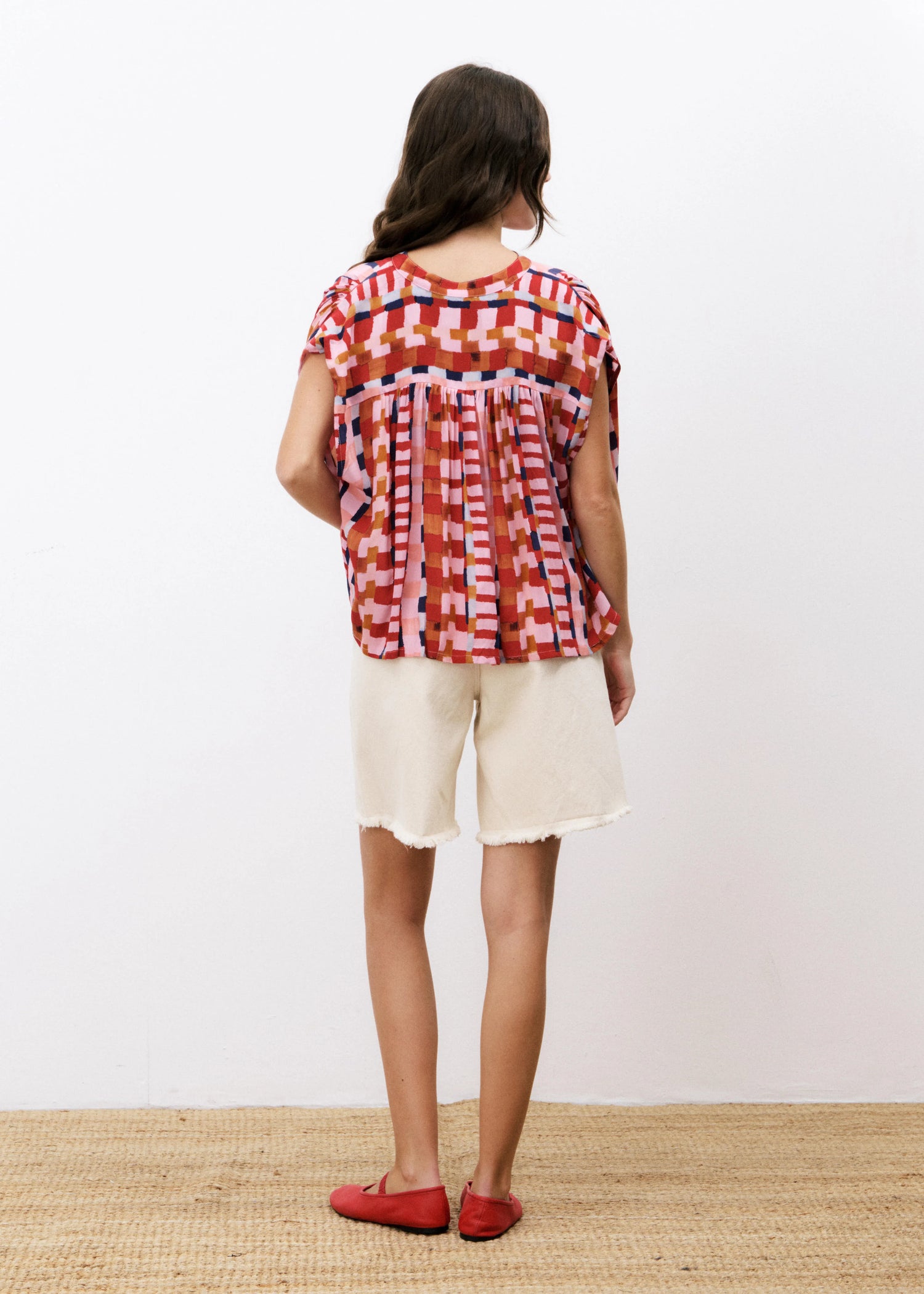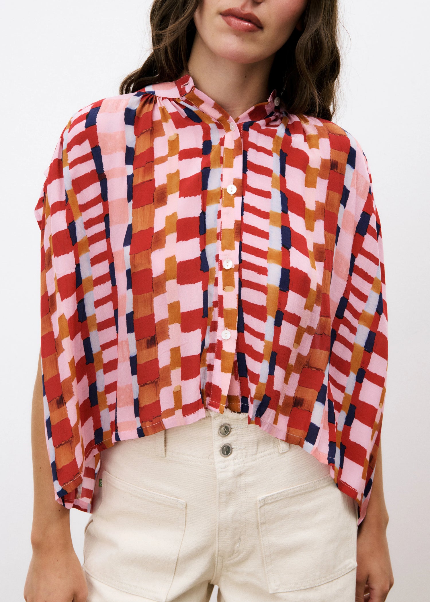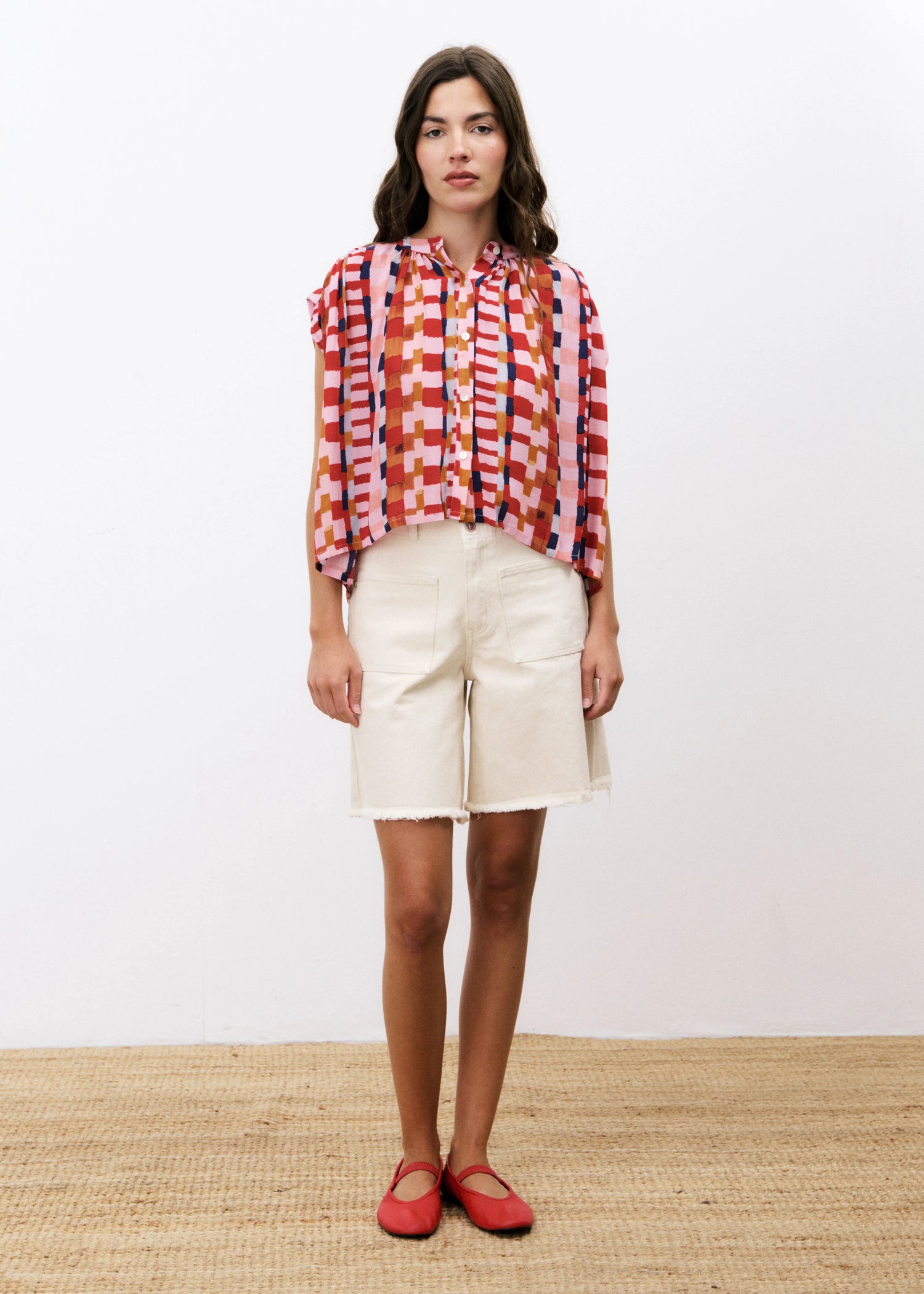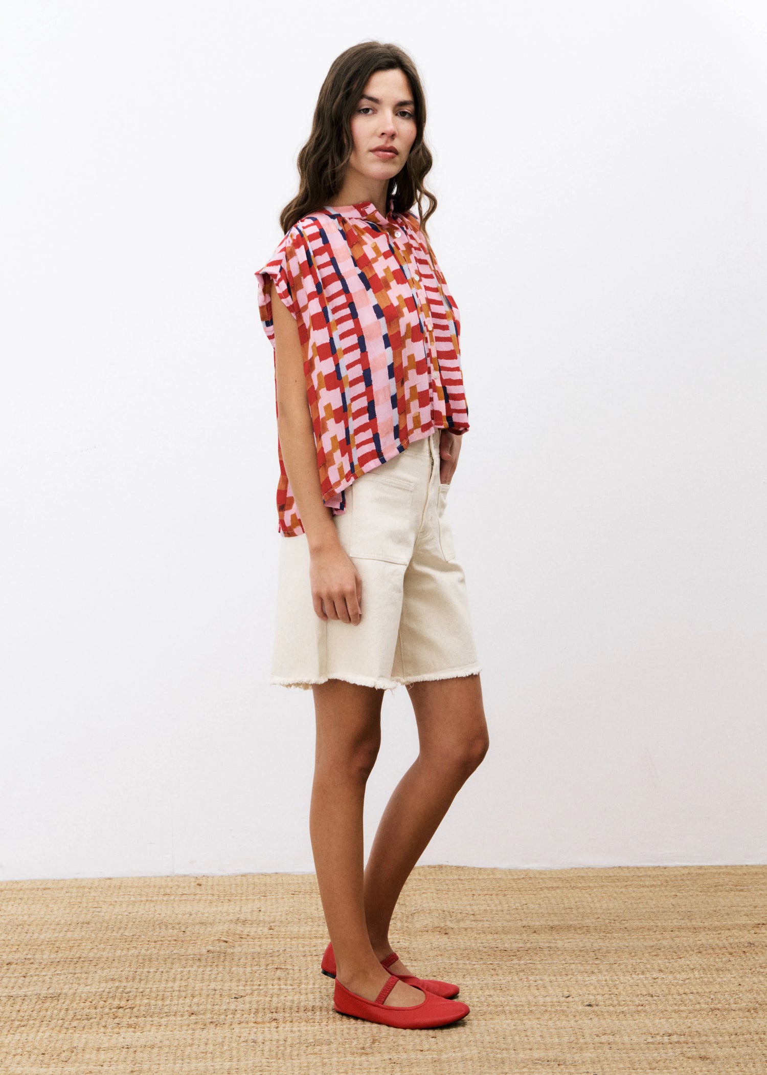 The FRNCH Edlyne Blouse features a sleeveless design with a refined Mao collar, showcasing an exclusive pink and red FRNCH print. Crafted from fluid fabric, this top drapes elegantly, combining comfort with sophisticated style.