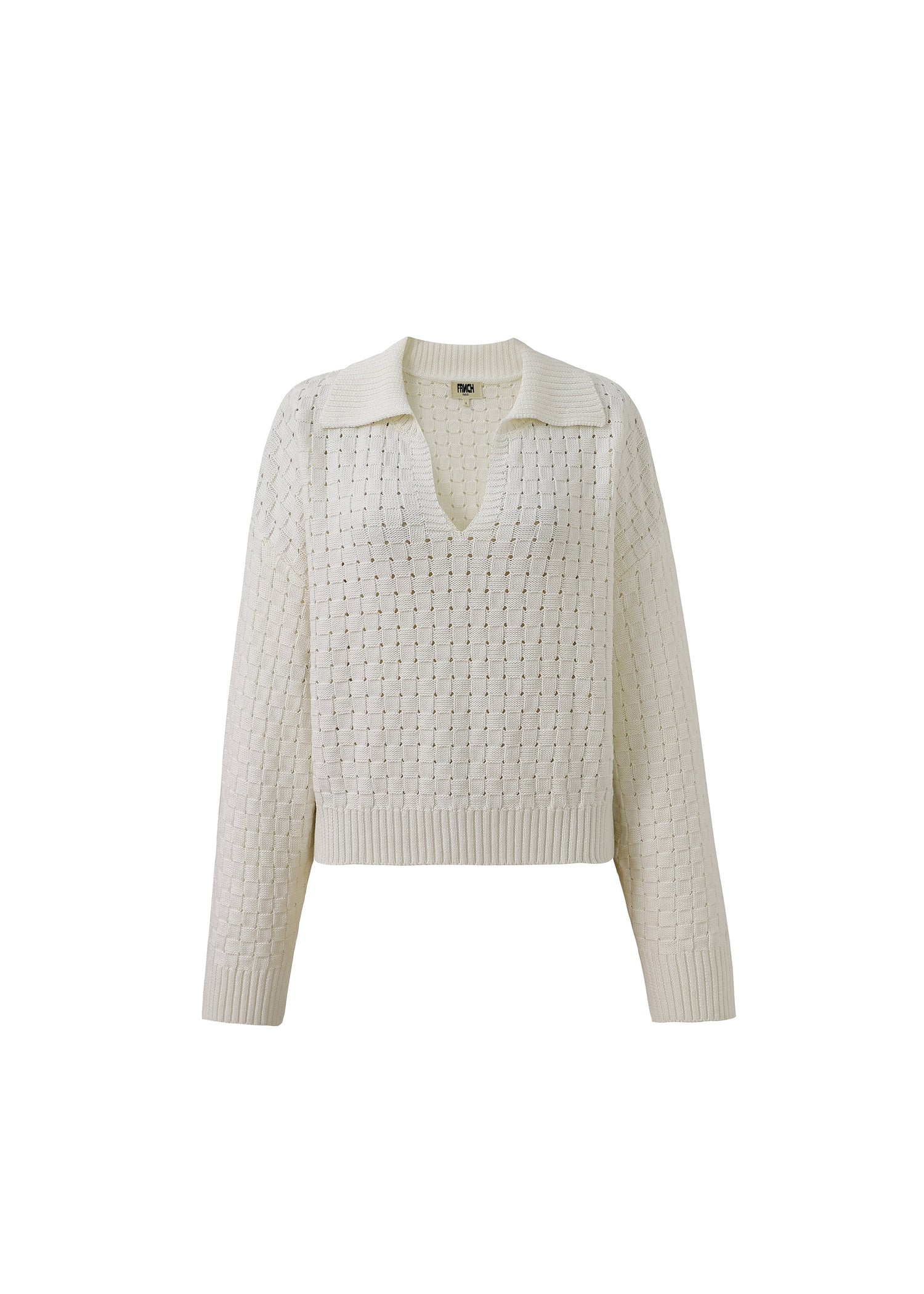 The FRNCH Paulia Knit combines elegance and comfort with its openwork cotton knit fabric. Featuring a cream color, long sleeves, and a collar with a flattering V neckline, this sweater offers breathable warmth and a refined silhouette ideal for sophisticated layering. Its natural cotton composition ensures softness against the skin while maintaining lasting durability.